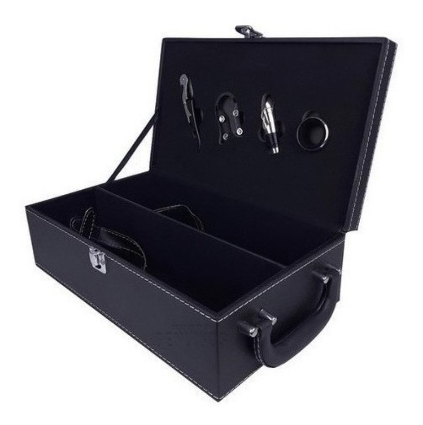 Maleta para Vinho Luxo Cor Preta De Couro Esse produto incrível proporciona que você transporte seu vinho de forma segura e elegante. Ótima opção para presente também. Capacidade para até dois vinhos e ainda conta com quatro acessórios quatro indispensáveis para você desfrutar seu momento. Acessórios inclusos: - Um saca-rolhas dois estágios - Um corta lacres - Um bico dosador - Um anel corta gotas Dimensões da maleta: 36 largura x 11,5 altura x 20 comprimento