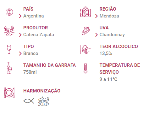 O Vinho Angelica Zapata Chardonnay 2018 leva a assinatura da Catena Zapata, vinícola do visionário Nicolás Catena. Produzido com a uva Chardonnay, oriunda de vinhedos localizados na região vitivinícola de Mendoza, na Argentina. De coloração dourada com reflexos esverdeados, revela, no nariz, aromas de frutas cítricas e um toque de baunilha. Em boca, o Vinho Angelica Zapata Chardonnay 2018 é fresco e mineral, contando com ótima acidez e um final longo e intenso.