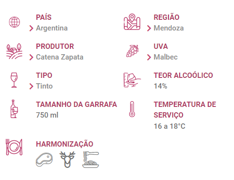 De coloração rubi profunda, revela, no nariz, aromas florais, notas de frutas vermelhas maduras, como de cereja e cassis, nuances de especiarias, além de um toque de tabaco. Em boca, o Vinho Catena Zapata Malbec Argentino 2019 apresenta incrível finesse, contando com taninos maduros e boa acidez. Uma verdadeira raridade, esse rótulo goza de um excepcional potencial de guarda, podendo envelhecer na garrafa por até quarenta anos!