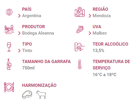 De coloração rubi intensa, revela aromas de frutas negras maduras, como ameixa, cereja e groselha, notas terrosas, além de toques de alcaçuz, café e caramelo. Um vinho argentino rico, concentrado e intenso. Em boca, apresenta taninos refinados e um final longo e persistente.