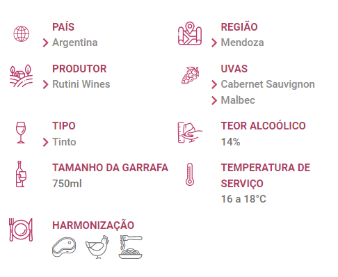 O Vinho Rutini Cabernet Sauvignon Malbec leva a assinatura da Rutini Wines, uma tradicional e renomada vinícola da Argentina! Elaborado com um corte das uvas Cabernet Sauvignon e Malbec, oriundas de vinhedos no Vale do Uco, dentro da região