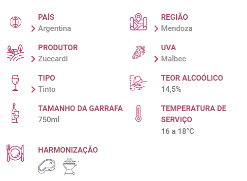 O Vinho Zuccardi Serie A Malbec é uma ótima opção para quem quer começar a desvendar os maravilhosos rótulos da vinícola argentina Zuccardi. Exala aromas de frutas maduras, como cereja e ameixa, além de sugestões de chocolate, licor, tabaco e especiarias. Um Vinho Tinto com um textura agradável de taninos firmes e acidez equilibrada.